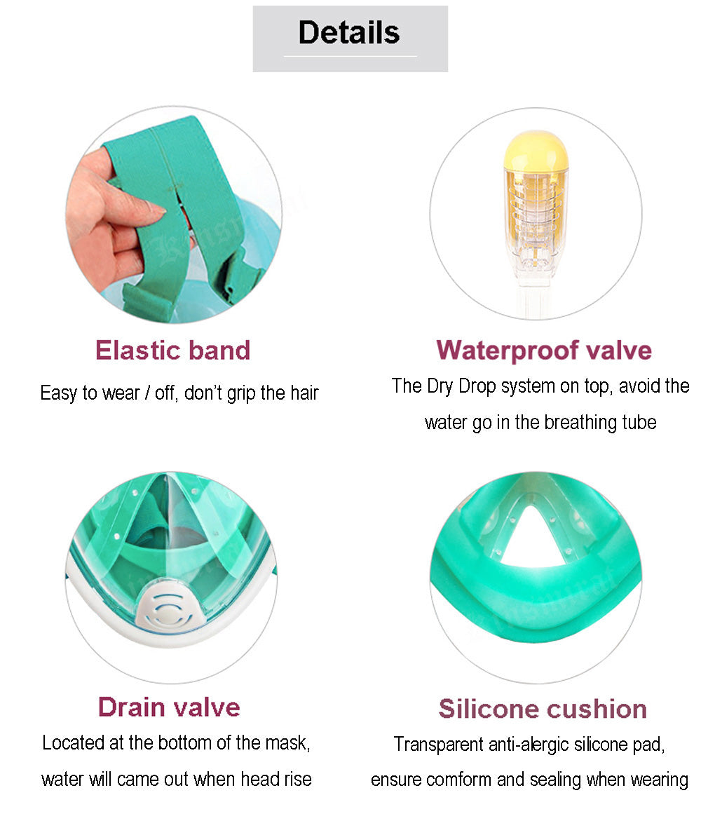 Top Dry System: Prevents water entry when submerged.soft safe silicone seal around the face, leakage can be drained off by the drain valve via lift head